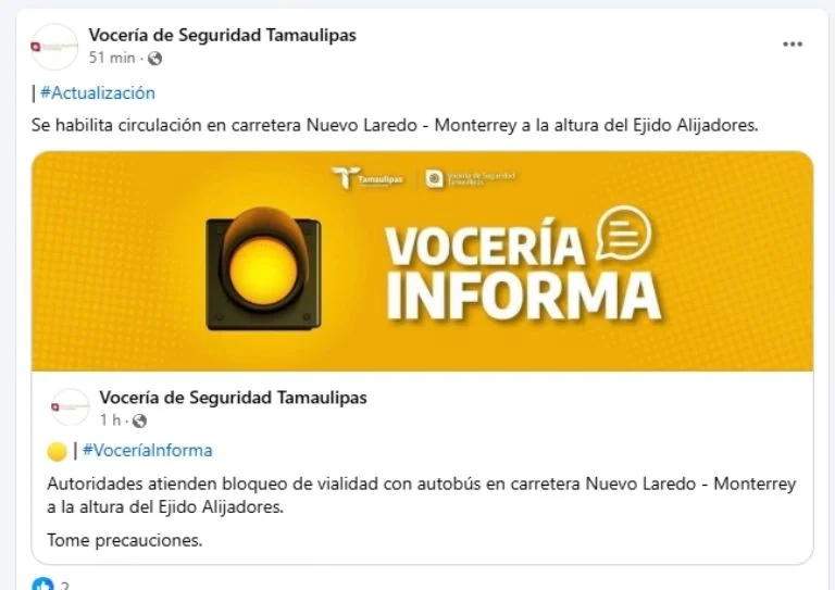 «Se habilita la circulación en carretera Nuevo Laredo-Monterrey a la altura del Ejido Alijadores», informó en un breve comunicado en sus redes sociales.