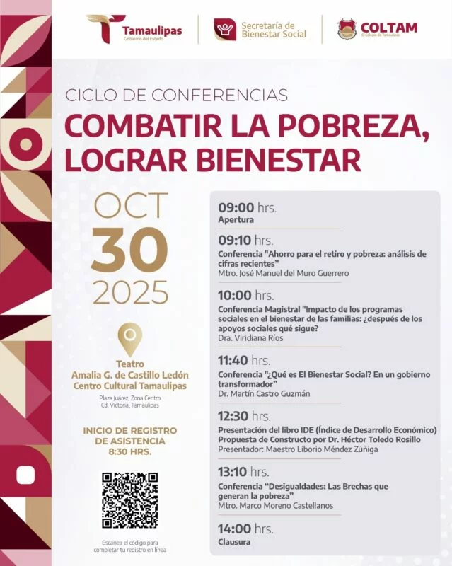 El Gobierno del Estado a través de la Secretaría de Bienestar Social y el Colegio de Tamaulipas, organizan el ciclo de conferencias “Combatir la Pobreza, Lograr Bienestar”, que se desarrollará el 31 de octubre en el Teatro Amalia G. de Castillo Ledón, a partir de las 9:00 horas.