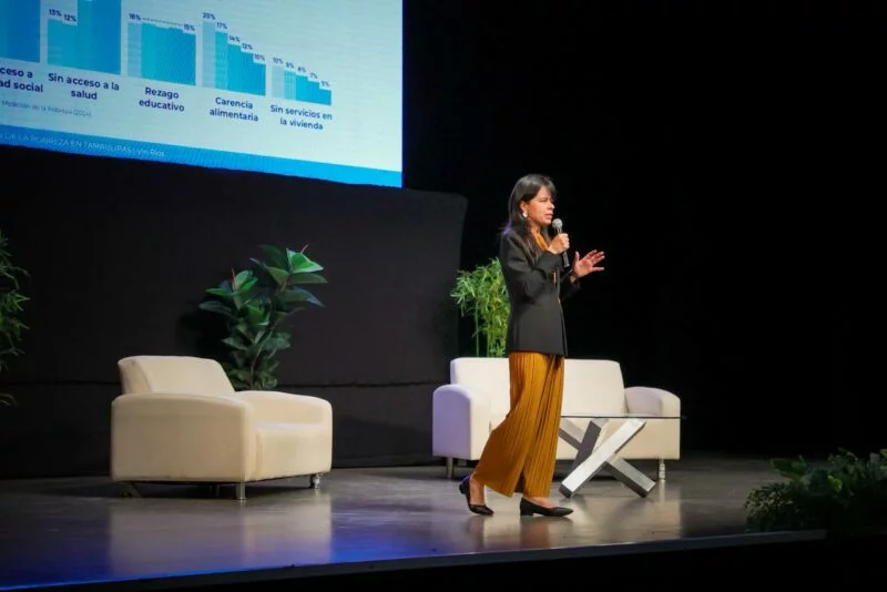 Durante el evento, realizado en el Teatro Amalia G. de Castillo Ledón, la titular de la SEBIEN destacó que Tamaulipas se encuentra entre los primeros diez estados de México con menor porcentaje de población en condiciones de pobreza.