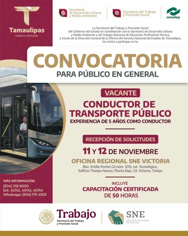 La Secretaría del Trabajo y Pårevisión Social del Gobierno del Estado, en coordinación con la Secretaría de Desarrollo Urbano y Medio Ambiente y el Colegio Nacional de Educación Profesional Técnica (CONALEP), informaron la apertura de la Convocatoria para Conductor de Transporte Público, dirigida al público en general mediante el Servicio Nacional de Empleo Tamaulipas.