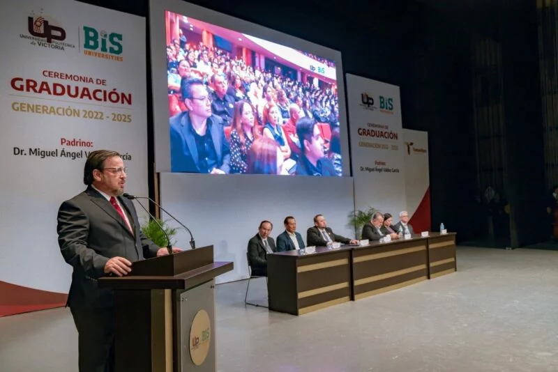 Poner al servicio de la sociedad sus conocimientos, capacidades y talentos desarrollados durante su formación profesional, fue el llamado que hizo Miguel Ángel Valdez García, secretario de Educación de Tamaulipas, a las y los graduados de las diferentes carreras que conforman la Generación 2022–2025 de la Universidad Politécnica de Victoria (UPV), de la cual fue padrino.