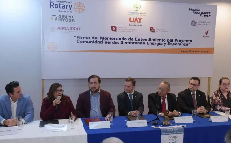 En ese marco, se llevó a cabo la firma del convenio de colaboración del proyecto Comunidad Verde, una alianza estratégica encabezada por el Club Rotary Ciudad Victoria, junto con la Secretaría de Desarrollo Urbano y Medio Ambiente (SEDUMA), la Secretaría de Educación de Tamaulipas (SET), la Universidad Autónoma de Tamaulipas (UAT), la SEMARNAT, el Gobierno municipal de Victoria, la asociación civil Latiendo por Tamaulipas y el Grupo HYCSA.