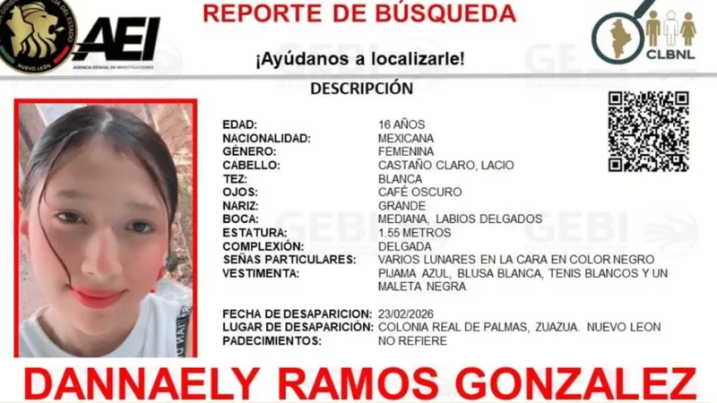 La familia de la menor de 16 años, Dannaely Ramos González, ha declarado que no han podido ubicarla desde el pasado lunes 23 de febrero, por lo que las autoridades estatales emitieron la correspondiente ficha de búsqueda con el fin de su difusión, para obtener el apoyo de la comunidad regiomontana en su búsqueda.