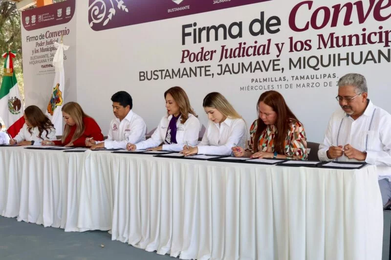 Roxana Guerrero Galván, directora general del IDPET, participó como testigo de honor acompañando a la magistrada presidenta del Supremo Tribunal de Justicia del Estado de Tamaulipas, Tania Gisela Contreras López, en este acto que formaliza la cooperación institucional con los gobiernos municipales de Jaumave, Palmillas, Bustamante y Miquihuana.