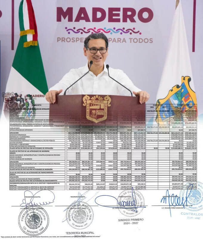 La Cuenta Pública Consolidada del ejercicio fiscal 2024 del Ayuntamiento de Ciudad Madero, firmada institucionalmente por el presidente municipal Erasmo González Robledo y presentada conforme a los criterios de la Ley General de Contabilidad Gubernamental, permite reconstruir la arquitectura financiera de la administración local.