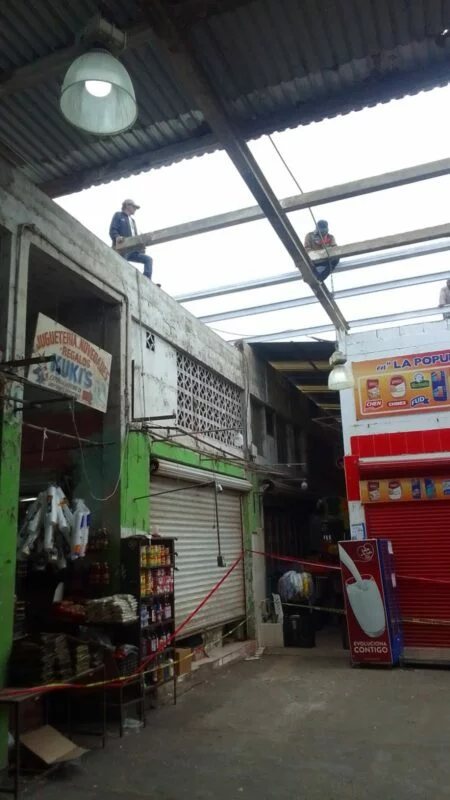 Las labores, coordinadas por la Dirección de Mercados a cargo de Aurelio Cantú, se concentran en tres acciones principales: la pintura de las cortinas metálicas en el acceso principal del mercado, la sustitución de láminas en la techumbre de la plazoleta comercial y la instalación de una lona protectora destinada a resguardar del sol a los comerciantes y clientes que frecuentan la zona frente al alero de la plaza principal.
