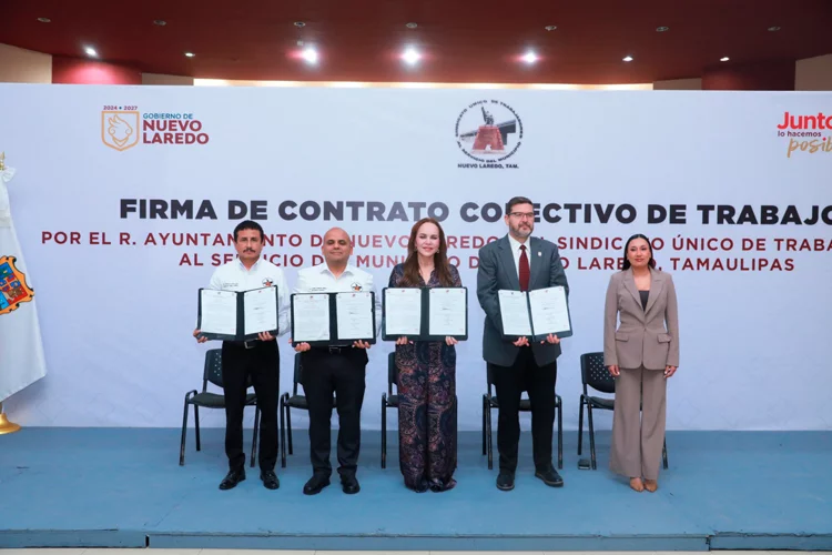 Nuevo Laredo, Tamaulipas.- En un acto que refuerza el compromiso con la base trabajadora del municipio, la presidenta municipal, Carmen Lilia Canturosas Villarreal, encabezó la firma del Contrato Colectivo de Trabajo con el Sindicato Único de Trabajadores al Servicio del Municipio de Nuevo Laredo, consolidando mejoras significativas en las condiciones laborales y el bienestar de las y los empleados municipales.